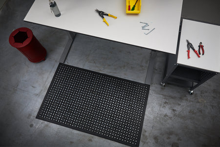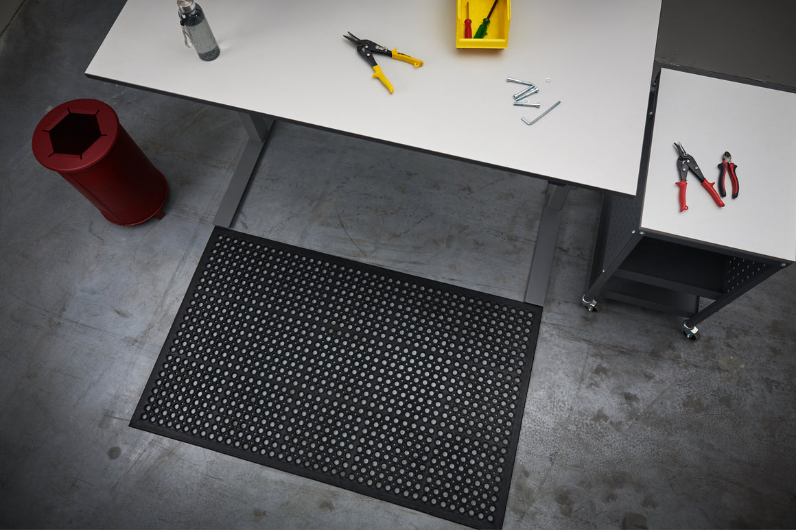 The mat features bevelled edges to reduce trip hazards and is suitable for both dry and wet environments, indoors and outdoors. Safe Top works equally well as a heavy‑duty entrance mat or as anti‑slip and fatigue‑relieving flooring at workstations such as bars and light industrial areas.