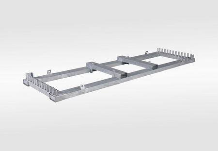 Heavy-duty transport pallet made of galvanized steel, designed to hold up to 30 temporary fence panels (3.5 m). Built for efficient storage, handling, and transport of fencing systems on construction sites or event areas.